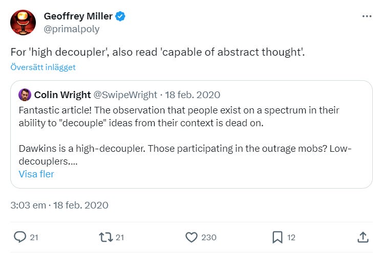 In my experience eugenics seems to be a lightning-rod for someone online using the term "high-decoupler". In 2020 Richard Dawkins got some heat for tweeting: